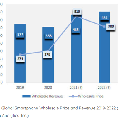 2021 智能手机平均批发价格为 310 美元/部,同比 11% 增长。智能手机批发的整体收入为 4350 亿美元,同比增长 21%。主要受益于发货量的反弹(对比 2020 年的疫情影响)。