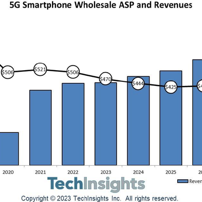 预计 5G 智能手机销售收入在 2028 年接近 5000 亿美元。5G 智能手机平均销售单价到 2028 会下降到 412 元。