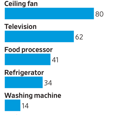 截止到 2020年3月,印度家庭持有常用电器的渗透率。