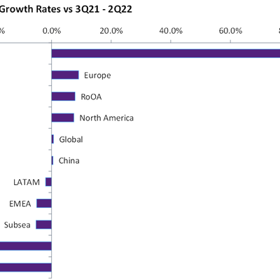 从提前量角度,网络通常会先行建设,尤其是耗时更长的光传输网络。附图是 2021Q3-2022Q2 全球各地区光传输设备的销量变化,可以看到印度的加速情况。