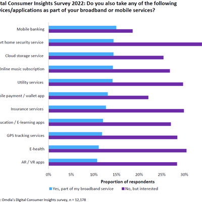 围绕此话题,OMDIA 咨询公司在包含中国在内的全球市场调研显示,有十多项新业务,消费者中有 10~15% 的比例愿意捆绑在运营商的宽带套餐中。Top 3 分别是:移动银行、智能家居及安防、云存储。