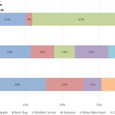 (1) 67% 的 iPhone 购买自电信运营商渠道;通信套餐捆绑手机的威力仍然是巨大的;