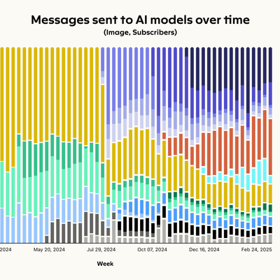 从第三方 Chatbot POE 的用户使用角度看,图像生成大模型曾经的领头羊 OpenAI DALL-E 的用户交互量份额从 2024 年初的接近 80% 下跌到 2025 年 2 月的 9.9%。