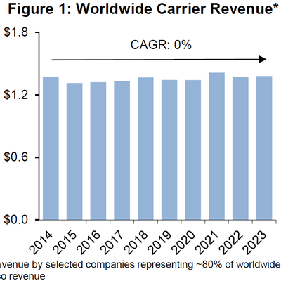Dell’Oro 咨询公司汇总了全球主流运营商(涵盖 80% 的收入占比)在 2014-2023 十年期间的收入数字。研究结论就是十年来的年复合增长率 CAGR 为 0%。
