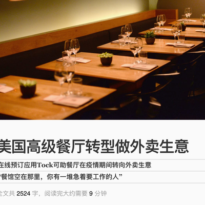订餐 SaaS 应用 Tock 转型 Tock to Go 也值得关注。模糊感觉中国也有类似可能空间(如此巨大的餐饮业,应可容纳相对利基市场的玩家,在美团饿了么之外)。