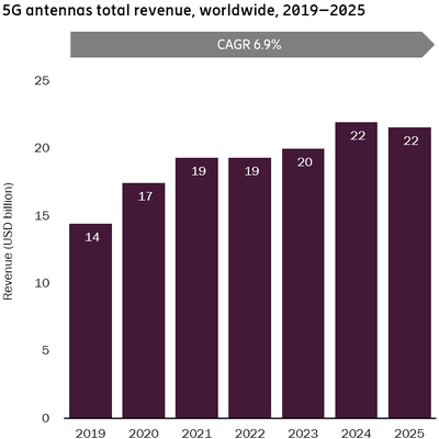 Analysys Mason 估计 2020 年全球 5G 网络天线的产品收入为 170 亿美元,预计未来几年会保持在 6.9% 的复合增长,到 2024~2025 可达到 220 亿美元。
