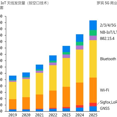 其中蓝牙和 Wi-Fi 是最大的品类,两者加在一起接近 50 亿套。2/3/4/5G 会达到 7.5 亿套,NB-IoT + LTE-M 可达到 4.44 亿套。