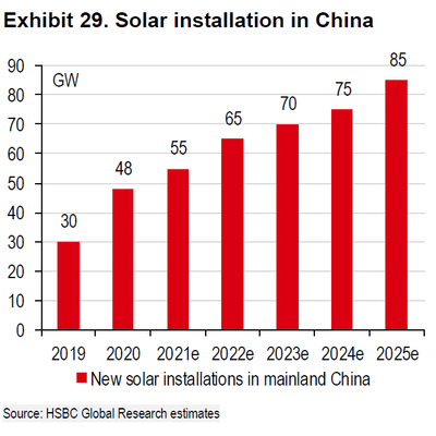 HSBC 预测十四五期间,中国市场会继续保持高速增长,2025 年累计安装量可达到 85 GW,同比 2020 接近翻番。