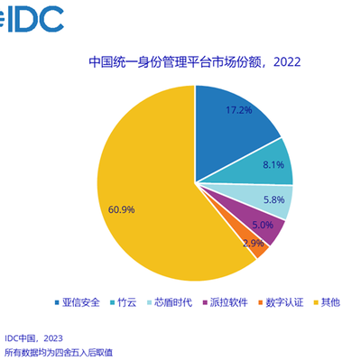 IDC 咨询公司数据显示,中国统一身份管理平台市场在 2022 年实现了 7.1% 的同比增长,规模达到3.5亿美元。亚信安全、竹云、芯盾时代位居份额前三位置。