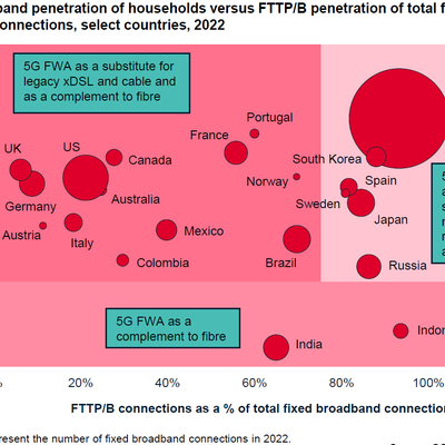 (1) 固定宽带在家庭渗透率很低的地区(很多用户家里没有固定宽带的条件),那 5G FWA 可以作为 FTTx 光纤宽带的互补品。代表性市场是印尼和印度;