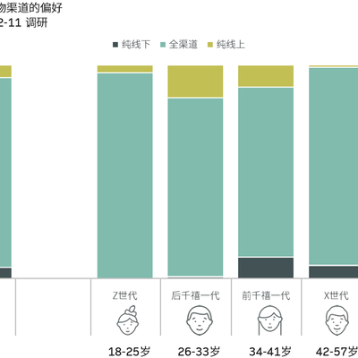 18 - 33岁的人群在纯线下渠道消费占比为零;34岁及以上人群有 5-10% 的受访者表示自己全部购买行为都在线下渠道完成。