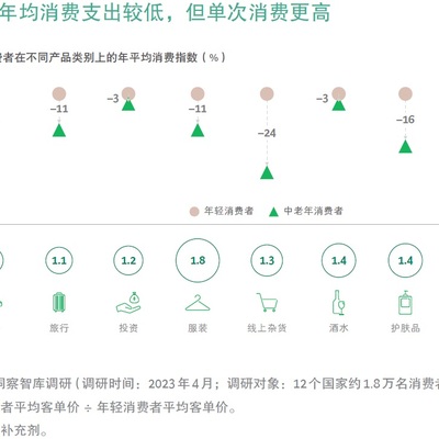 BCG 在 2023 年 4 月针对 8 个国家的 1.8 万名消费者调研显示,中老年消费者你那军消费支出虽然相对较低,但单次消费更高;而且是所有品类都显示如此特征。