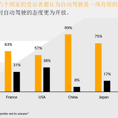 汽车 Tier-1 供应商德国大陆集团(Continental)针对中国、德国、法国、挪威、美国和日本的个人进行调研显示:① 中国消费者对于自动驾驶的态度更为开放;② 在亚洲,愿意交出汽车控制权的人比其他任何国家要多。