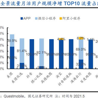 QuestMobile 的监测数据,Top 10 移动互联网应用,有多少比例来自 App,多少来自微信小程序和支付宝小程序。'