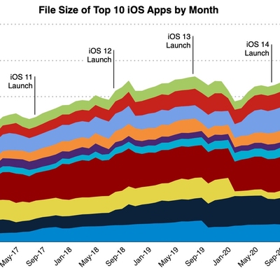 根据 Sensor Tower 的数据,美国 5 月份下载量排名前 10 的 iPhone 应用程序大小基本是五年前的四倍,需要 2.2 GB 的存储空间(仅应用程序,不包括安装后新产生的内容下载)。