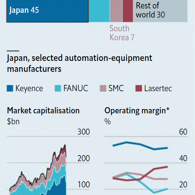 经济学人的报道,2020 年全球工业机器人市场,日本以 45% 的份额摇摇领先,中国(12%)、韩国(7%)和德国(6%)位居其后。