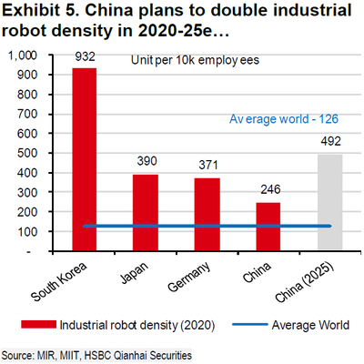 根据 HSBC 的研究,中国在 2020 年密度为 246 台/万人,预计到 2025 年可达到 492 台/万人。五年内密度翻一番。