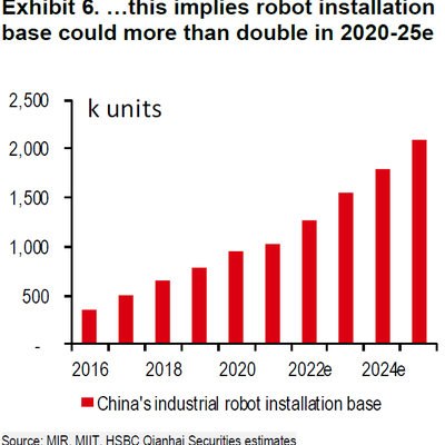 根据 HSBC 的研究,预计中国在 2025 年现网部署的工业机器人将超过两百万部。