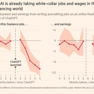 大量自由职业者会通过白领类的 “零工经济” 网站来接活,比如:设计、文案等。研究数据显示,自 ChatGPT 上市之日起,无论是工作岗位数量发布,还是收入数据,均呈现明显的下滑趋势。