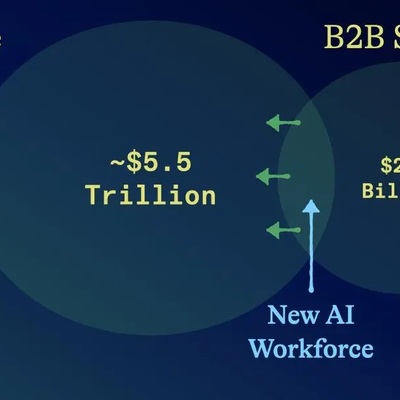 风险投资机构 NFX 绘制了一张图。以美国市场为例,B2B SaaS 目前的开支是 2,300 亿美元,而美国企业在知识型劳动力上的支出是 5 万亿美元的体量。