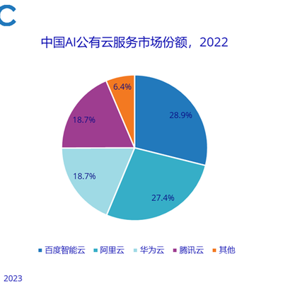 IDC 咨询公司数据显示,2022 年中国 AI 公有云服务市场规模为约 80 亿元,同比增长了 80.6%。百度、阿里云、华为云和腾讯云四家占据了 93.6% 的份额。