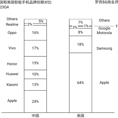 作为全球最大的两个智能手机市场,中国和美国在各品牌份额构成上有很大差异。