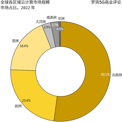 Gartner 研究显示,全球云计算各区域的市场规模差别极大。以 2022 为例,北美云计算市场规模占据了全球的 52.1%;欧洲和亚洲分别以 23.4% 和 18.4% 位居二三名。
