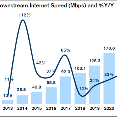 根据 OpenVault 的测试数据,美国家庭宽带用户的平均下行速率在 2021 年达到 240 Mbps,对比前一年提升了 41%。