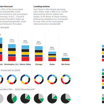 Equinix 预测 2021-2025 年期间,全球服务商和企业之间的各种网络互联带宽将保持 40% 的年复合增长率(CAGR)。其中,服务商将占据 57% 份额,其他垂直行业企业占 47%。