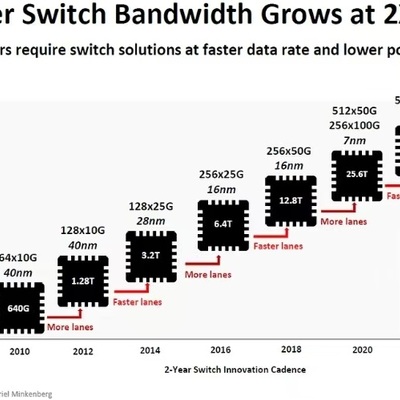2010 年主流的数据中心 ASIC 互联带宽是 64x10G,芯片制程是 40nm。2022 年互联带宽是 512x100G,芯片制程是 5nm。