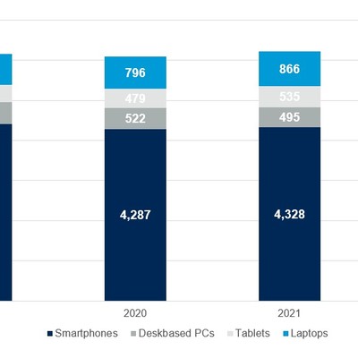 根据 Gartner 的研究,2021 年四大件的全球总保有量为 62 亿部,预计 2022 年会增加 3.2%,达到 64 亿部。