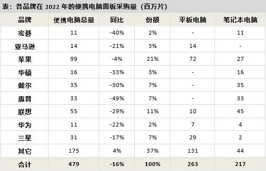 随着需求饱和和疫情消退,便携电脑的需求也大幅回落。我们可通过主要品牌厂家面板采购量的变化来验证。