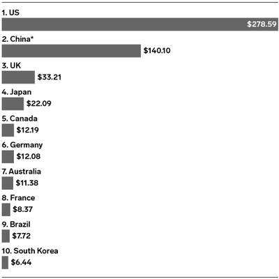 附图是 2023 年全球数字广告支出 Top 10 国家和地区。