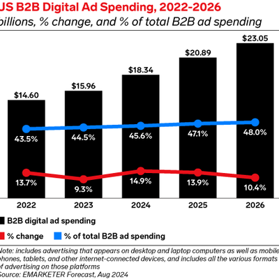 eMarketer 监测数据显示,美国企业 B2B 的广告支出比例在 2024 年为 45.6,预计到 2026 年可提升到 48%。