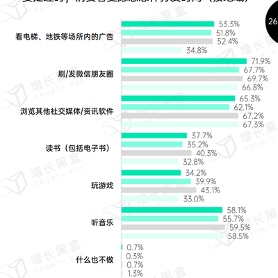 从增长黑盒的消费者调研看,消费者身处电梯、地铁等封闭环境时,看电梯、地铁广告的比例是很高的