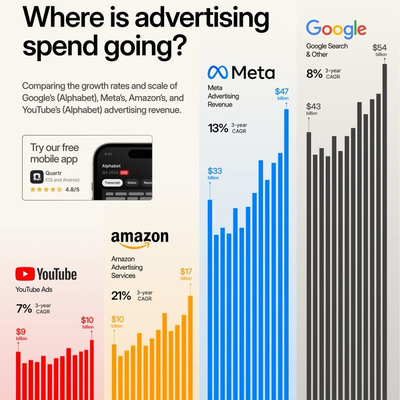 时至今日,即便很多地区互联网用户增长日趋乏力的背景下,但互联网广告收入,尤其是巨头的广告收入持续增长,远未到乏力之时。