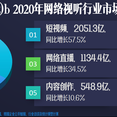 国家广电智库比较权威的一组数据,2020 年中国网络视听行业市场总空间 6,009 亿人民币,同比 2019 增长了 32.3%。 主要的几块市场构成: