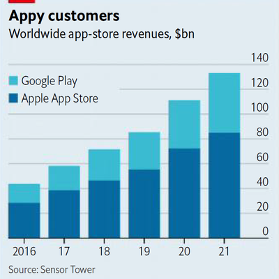 全球最大的两大应用商店 Apple AppStore 和 Google Play 在 2021 年的收入总盘子达到了 1,330 亿美元,是五年前的三倍。