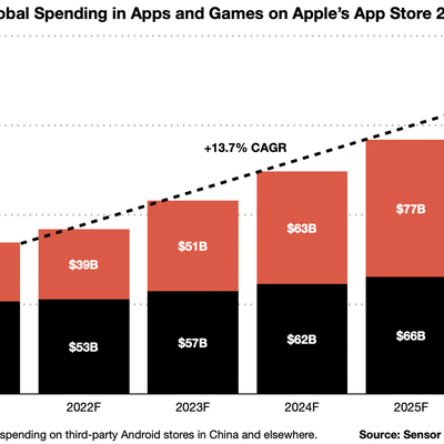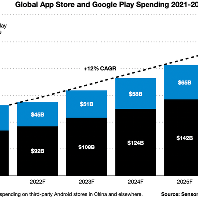 Sensor Tower 估计 2021 年,消费者在 AppStore 开支为 850 亿美元,在 Google Play 的开支为 470 亿美元。预计到 2026 年,前者开支会达到 1610 亿美元,而后者也会达到 720 亿美元。