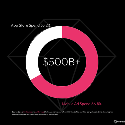 data.ai 预计整个 APP Economy(应用经济)市场价值约为 5,000 亿美元,其中 67% 来移动广告(3,360 亿美元),33% 来自应用商店(包含应用内购买)。