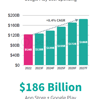Sensor Tower 的研究显示,2022 年 AppStore 和 Google Play 全球用户开支为 1,240 亿美元。预计 2027 年数字将攀升到 1,860 亿美元,CAGR 为 +8.4%。