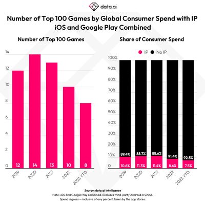 但这个趋势在最近三年有一定下滑,data.ai 预计 2023 年 Top 100 中只有 7 款会基于 IP。