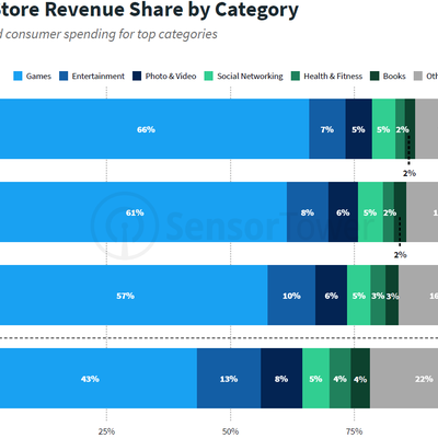 从创收的类别看,传统收入大户游戏的占比会持续降低,其他类别的崛起体现了 AppStore 的收入结构更加均衡。