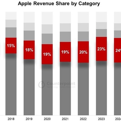 Counterpoint 预测 Apple 的服务收入在 2025 年将突破 1,000 亿美元,对整体收入的贡献达到 25%。