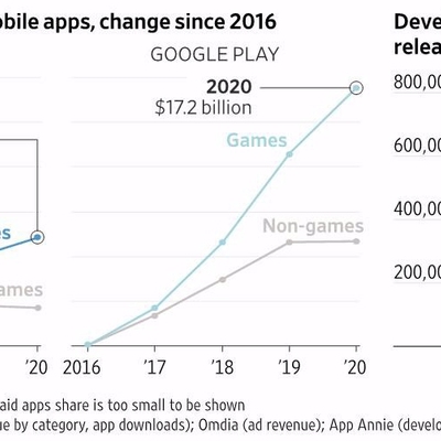 2020 年 App Store 和 Google Play 游戏类广告收入分别为 186 亿美金和 172 亿美金。