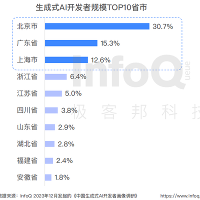根据技术社区 InfoQ 的调研,北京是生成式 AI 开发者聚集最多的地区,占到全国的 30.7%,广东和上海位居二三位。