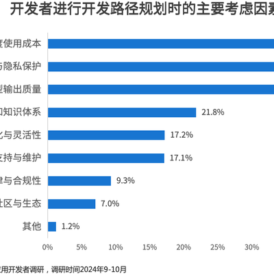 从易观和 CSDN 针对中国 AI 应用开发者的调研看,“领域数据量及数据获取难度使用成本” 是响 AI 应用开发者路径规划时最大的考虑因素。