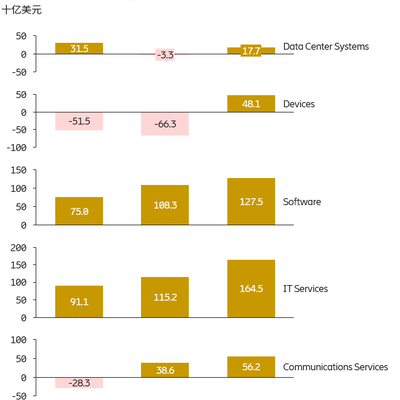 基于 Gartner 的全球 IT 开支数据,做了一下细项分析。我们把主要类别连续 2021-2024 连续三年的净增量折算出来,可以看到: