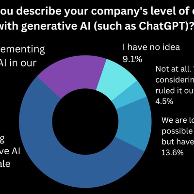 Venture Beat 在 2023 年的调研显示,70% 以上企业试验性应用生成式 AI(例如,ChatGPT 等)。其中,18.2% 的调研反馈 AI 被应用于日常运营工作,54.6% 有相关的实验。
