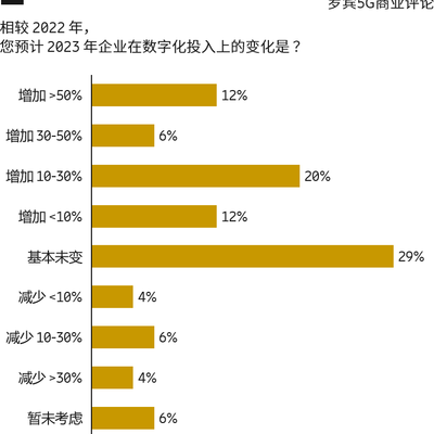 红杉资本中国对 19 个行业的 235 家企业的数字化相关管理者进行了调研。对比 2022 年,只有 50% 的企业反馈会在 2023 年增加数字化方面的投入。